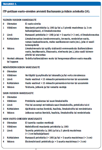 Hoitoa ohjaavat vuoto-oireet, ei trombosyyttien määrä. Jopa lapsilla, joilla on hyvin vähän trombosyyttejä (alle 10 × 109/l), vuodot rajoittuvat yleensä mustelmiin. Toisaalta harvinaisissa vaikeissa keskushermostovuototapauksissa potilailla poikkeuksetta trombosyyttitasot ovat olleet alle 20 × 109/l. Diagnosointivaiheessa vaikea vuoto-ongelma havaitaan noin 3 %:lla lapsista. Vuoto-oireita voidaan arvioida Buchananin ja Adixin asteikolla (14), jossa arvioidaan vuodon yleinen vaikeusaste (0-5) ja erikseen nenäverenvuodon, suun alueen verenvuodon ja ihonalaisen verenvuodon vaikeusaste (0-4) (taulukko 2 «»2).