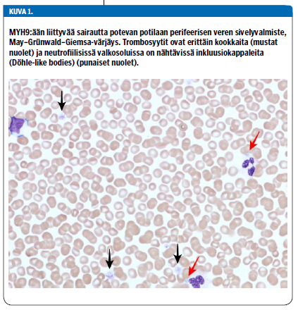 Yleisin perinnöllinen trombosytopenia on MYH9:ään liittyvä sairaus (MYH9-RD) (31,32). Se periytyy autosomissa vallitsevasti ja johtuu MYH9-geenin (myosin heavy chain 9) mutaatiosta.