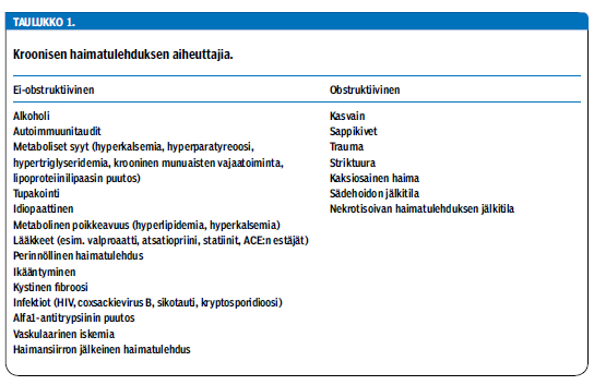 Alkoholi on tärkein sairauden taustalla oleva syy, jopa 90 %:ssa tapauksista (taulukko 1 «»1). Potilas on lähes poikkeuksetta suurkuluttaja, joka on käyttänyt alkoholia puhtaana alkoholina laskien 80-150 grammaa päivittäin 10-15 vuoden ajan ennen sairauden kliinistä puhkeamista (2). Lähes yhtä tärkeä kroonisen haimatulehduksen etiologinen tekijä on tupakointi (3). Muita syitä ovat sappikivitauti, metaboliset sairaudet (hypertriglyseridemia tai hyperparatyreoosi) ja perinnöllinen tautimuoto (perinnöllinen haimakalsinoosi). Syynä voi olla myös autoimmuunisairaus, esimerkiksi autoimmuunihaimatulehduksen jälkitila, tai sairaus liittyy primaariseen sklerosoivaan kolangiittiin, primaariseen biliaariseen kolangiittiin tai Sjögrenin oireyhtymään. Ikäihmisillä idiopaattisen ja autoimmuunitulehduksen osuus on suurempi kuin nuoremmilla (4).