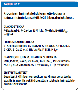 Kroonisen haimatulehduksen varhaisdiagnostiikkaan katsotaan kuuluvan etiologiaa ja haiman toimintaa kuvaavia laboratoriokokeita (taulukko 2 «»2). Seerumin amylaasi- ja lipaasitasot ovat yleensä normaalit tai lievästi suurentuneet. Haimasta suolistoon erittyvä elastaasi 1 poistuu muuttumattomana ulosteeseen, ja sen määrittämistä voidaan käyttää kroonisen haimatulehduksen diagnostiikassa. Pitoisuus yli 200 µg/g ulosteessa on normaali, 100-200 µg/g viittaa lievään haiman vajaatoimintaan ja alle 100 µg/g vaikeaan haiman vajaatoimintaan. Entsyymikorvaushoito ei häiritse tutkimusta, mutta voimakkaassa vesiripulissa tulos voi olla väärä positiivinen. Tutkimus voidaan hyvin tehdä myös avoterveydenhuollossa kroonista haimatulehdusta epäiltäessä.
