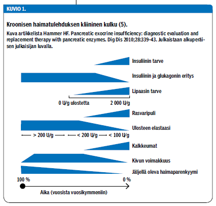 Kroonisen haimatulehduksen aiheuttamassa haiman vajaatoiminnassa imeytymishäiriön oireet ilmaantuvat vasta taudin myöhäisessä vaiheessa (kuvio 1 «»3) (5). Endokriininen haiman vajaatoiminta ilmaantuu myös suhteellisen myöhään. Noin 10 %:lle potilaista, joilla on alkoholin aiheuttama krooninen haimatulehdus, kehittyy diabetes. Haiman ekso- ja endokriinisestä kapasiteetista 80-90 % on tuhoutunut, ennen kuin diabetes tai imeytymishäiriö ilmaantuu. Krooniseen haimatulehdukseen liittyy myös osteopenian ja osteoporoosin riski.