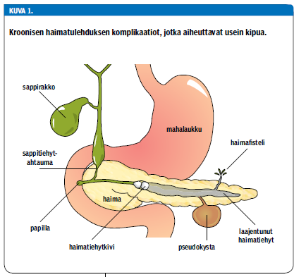 Krooninen haimatulehdus on seurausta toistuvista akuuteista haimatulehduksista, jotka johtavat haimakudoksen korvautumiseen sidekudoksella (1). Sidekudoksen lisääntyminen johtaa etenevään haiman ekso- ja endokriiniseen vajaatoimintaan. Sairauteen liittyy elämänlaadun huonontumista ja erilaisia pitkäaikaisvaikutuksia, kuten kroonista kipua (kuvio 1 «»3). Se voi myös johtaa aliravitsemukseen. Muita pitkäaikaiskomplikaatioita ovat diabetes ja haimasyöpä.