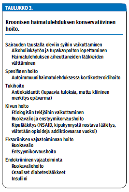 Kroonisen haimatulehduksen hoidossa on tärkeää kivun sekä eksokriinisen ja endokriinisen vajaatoiminnan hoito (taulukko 3 «»5). Alkoholinkäytön ja tupakoinnin lopettamista pidetään hyvin tärkeänä. Potilaille suositellaan vähärasvaista ruokavaliota. Toisaalta aliravitsemuksen tiedetään olevan tärkeä ennustetekijä, koska sen vaikeusaste korreloi suoraan komplikaatioiden esiintymiseen. Ravitsemusterapeutin konsultaatiota tulee tarjota kaikille kroonista haimatulehdusta sairastaville. Antioksidanttien (esim. seleeni, C-vitamiini, beetakaroteeni, E-vitamiini ja metioniini) on todettu tutkimuksissa lieventävän kipua, mutta niiden kliininen merkitys on edelleen epävarma (6).
