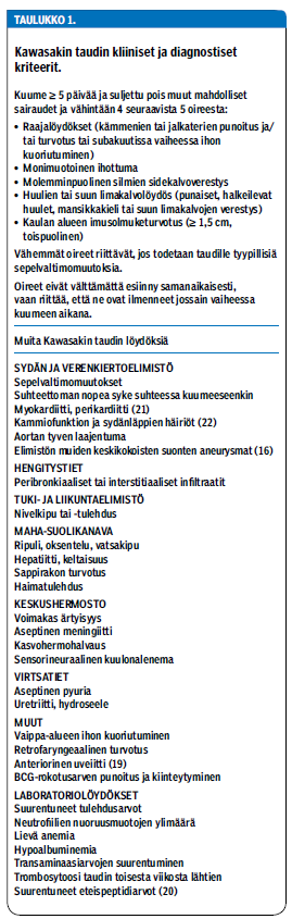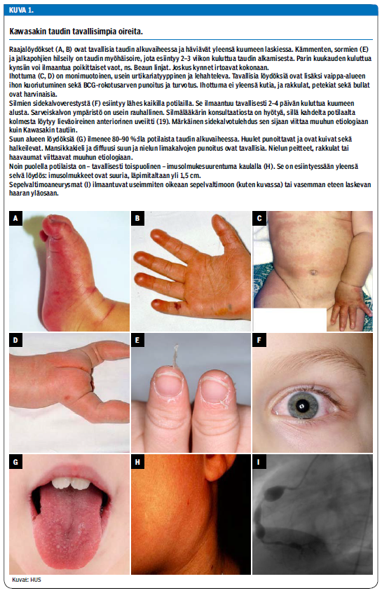 Seitsemän päivän kuumeilun jälkeen potilas sai lähetteen lastentautien päivystykseen. Vointi oli selvästi huonompi, ja löydöksinä todettiin silmien sidekalvojen verestys, nielun punoitus sekä vartalon laaja-alainen eksanteema. Kaulalla ei todettu poikkeavia imusolmukesuurentumia eikä raajoissa löydöksiä. Tulehdusarvot olivat suurentunet: CRP-pitoisuus oli jo 110 mg/l ja leukosyyttien määrä 18,4 E9/l. Syke oli 190/min. Lapsi otettiin infektio-osastolle, ja suoneen annettava kefuroksiimihoito aloitettiin. Kawasakin taudin kriteereistä täyttyivät kuume ja kolme viidestä pääoireesta (taulukko 1 «»1). Sydämen kaikukuvauksessa todettiin tautiin sopien sepelvaltimoiden tyvien laajentumat, kaliiberin vaihtelua ja perikardiumnesteilyä.
