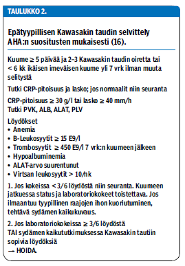 Epätyypilliseksi tai epätäydelliseksi Kawasakin taudiksi kutsutaan tilannetta, jossa kliiniset kriteerit eivät täyty (taulukko 2 «»3). Tilanne on tavallisin ikäjakauman ääripäissä eli alle 1-vuotiailla ja yli 9-vuotiailla. Näissä ikäryhmissä sepelvaltimomuutokset ovat tavallisia ja kuolleisuus tautiin yleisintä. Imeväisikäisillä tavallisimmat löydökset ovat kuume ja ihottuma, ja puuttumaan jäävät useimmiten lymfadenopatia ja raajamuutokset. Laboratoriolöydöksissä ei ole eroa ikäryhmien välillä (18).