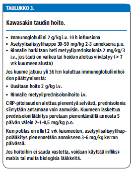 Hoidon kulmakivi on suoneen annettu immunoglobuliini (taulukko 3 «»4). Kriteerien täyttyessä tai selvässä tautiepäilyssä hoito tulisi aloittaa viipymättä. Taudin komplikaatiot ovat pahimmillaan fataaleja, ja ajoissa aloitettu immunoglobuliinihoito on tehokasta ja vaaratonta (23). Jotta sepelvaltimomuutosten kehittyminen saataisiin ehkäistyä, hoito tulisi aloittaa 7-10 vrk:n kuluessa kuumeen alkamisesta. Hoito on indisoitu myöhemminkin, jos kuume jatkuu eivätkä tulehdusarvot pienene (mikä kertoo inflammaation jatkumisesta) (16). Rajut oireet kertovat voimakkaasta inflammaatiosta ja ovat huonomman ennusteen merkkejä. Tällöin tehokas hoidon aloitus on erityisen tärkeää (taulukko 3 «»4) (8,24).