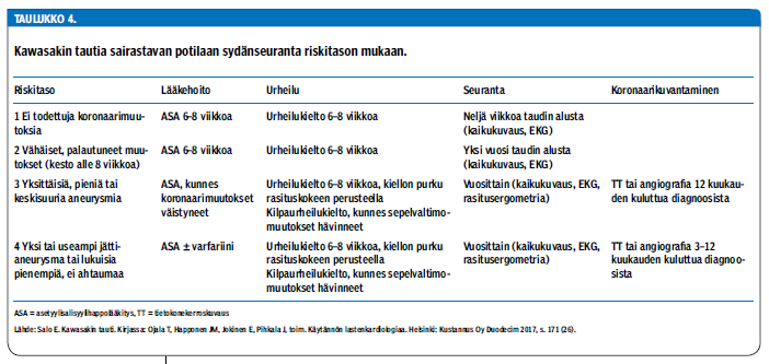 Yleensä immunoglobuliinihoito lievittää nopeasti potilaiden oireita, ja he voivat kotiutua muutaman päivän kuluessa. Koska vakavat sepelvaltimokomplikaatiot saattavat kehittyä vasta kotiutumisen jälkeen, sydämen kaikukuvausta suositellaan diagnoosivaiheessa sekä 2 ja 6 viikon kuluttua taudin alkamisesta (taulukko 4 «»5). Myös sydämen vajaatoiminta, rytmihäiriöt ja sydänlihastulehdus voivat oireilla vasta kotiutumisen jälkeen. Kliinistä tutkimusta suositellaan kontrollikäyntien yhteydessä sekä vuoden kuluttua taudista.