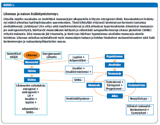 Lihavuus heikentää lisääntymispotentiaalia erityisesti hypotalamus-aivolisäke-munasarja-akselin toiminnan häiriintymisen vuoksi. Ylipaino on merkittävä anovulatorisen infertiliteetin riskitekijä. Keskeisenä mekanismina on insuliiniresistenssi ja siitä aiheutuvat suorat ja välilliset vaikutukset. Lihavien naisten veren insuliinipitoisuus on suurentunut, ja tämän tiedetään stimuloivan androgeenituotantoa munasarjoissa (5). Androgeenit aromatisoituvat perifeerisessä rasvakudoksessa estrogeeniksi. Se puolestaan vaikuttaa negatiivisen palautevaikutuksen kautta gonadotropiinien eli follikkelia stimuloivan hormonin (FSH) ja luteinisoivan hormonin (LH) eritykseen (6). Tästä seuraa ensin munasolun kypsymisen ja myöhemmin kuukautiskierron häiriöitä.