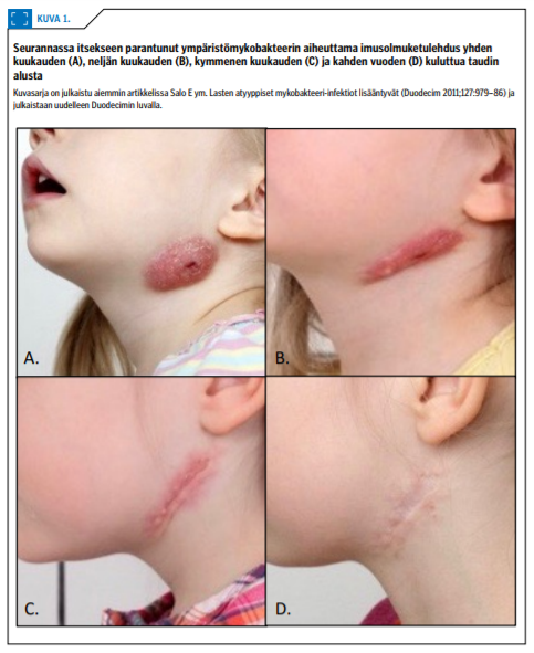 Nontuberculous mycobacteria (NTM) are a large group of ubiquitous environmental bacteria. In children NTM infections present predominantly as cervicofacial lymphadenitis between 1 and 5 years of age. Other clinical manifestations, such as skin, soft tissue, lung or disseminated infection, are rare. Bacillus Calmette-Guérin (BCG) immunisation offers protection against childhood NTM disease. Since discontinuation of universal BCG immunisations in Finland childhood NTM infections have increased. In Finland, the incidence of culture confirmed NTM infection in children under five years of age is approximately 4/100 000/year. The usual clinical presentation is prolonged unilateral cervicofacial lymphadenitis that slowly develops into an abscess with discharge. The child is otherwise healthy. The differential diagnosis of prolonged lymphadenopathy includes other bacterial causes and malignancies and, therefore, the patient must be referred to a paediatrician for consultation. The clinical presentation and progression of NTM lymphadenitis is usually distinctive, however tuberculosis (TB) must be considered in those with a high TB risk. Complete blood count and C-reactive protein are usually normal. Ultrasound imaging and a novel blood based immunodiagnostic test can provide additional diagnostic clues to support the clinical diagnosis rendering further invasive investigations unnecessary. There is no good evidence concerning the optimal treatment of NTM lymphadenitis. However, observational studies and clinical experience show that without any treatment the lymphadenitis heals well within a year. In some cases, surgery can expedite the healing. Early surgical intervention and removal of the infected lymph node is possible if the risks of surgery, e.g. facial nerve palsy, are small. NTM lymphadenitis should not be treated with antibiotics. In Finland, NTM lymphadenitis is an emerging disease that is still new to many clinicians. Early recognition is essential so that unnecessary concern, investigations and treatments can be avoided.