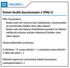 Suomessa koulu- ja opiskeluterveydenhuollossa käytetään yleisesti RBDI-oirekyselyä (Beckin lyhyestä masennusoirekyselystä muokattu kysely) (15). Myös PHQ-2 (Patient Health Questionnaire-2) -mittarin kaksi masennuskysymystä (taulukko 1 «»2) seulovat kohtuullisen luotettavasti (16), vaikka suomalaisnuorilla toimivinta seulontarajaa ei ole tutkittu.