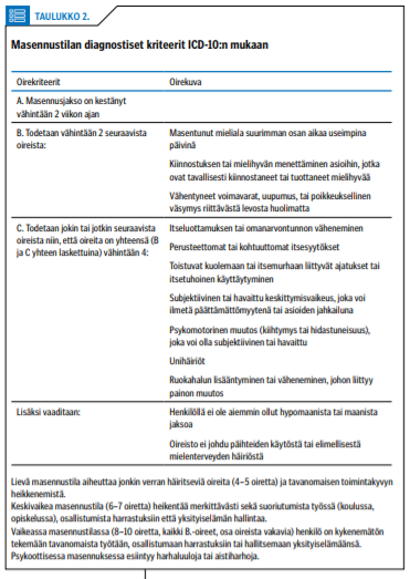 Nuorella masennustilan diagnoosi perustuu aina kliiniseen haastatteluun, jossa arvioidaan systemaattisesti ja suoraan kysyen masennuksen oireet. Diagnostiset kriteerit ovat samat kuin aikuisilla (taulukko 2 «»3).