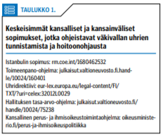 Lähisuhdeväkivallan seulonta ja uhrien hoitoonohjaus liikkuvat Seri-tukikeskusten tarjoamien palveluiden rajapinnalla. Taulukkoon 1 «»1 on kerätty keskeisimmät uhrien tunnistamista ja hoitoa ohjaavat kansalliset ja kansainväliset sopimukset.