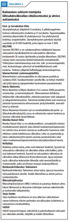 Lähisuhdeväkivallan uhrien jatkohoidon turvaamiseksi on suuri tarve kehittää tiiviimpää yhteistyötä viranomaisten ja kolmannen sektorin toimijoiden välillä. Taulukkoon 2 «»2 on kerätty keskeisiä kolmannen sektorin toimijoita, jotka tarjoavat laadukasta apua uhrien hoidossa. Kyseiset tahot järjestävät myös ammattilaisten aiheeseen liittyvää koulutusta.