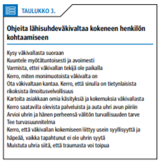 Hoitajien osuus potilaan aktiivisessa hoitoonohjauksessa on osoittautunut toimivaksi. Monet seulontapositiivisista potilaista ovat jo olleet psykiatrisen hoidon piirissä. Taulukkoon 3 «»4 on koottu ohjeita väkivaltaa kokeneen henkilön kohtaamiseen.