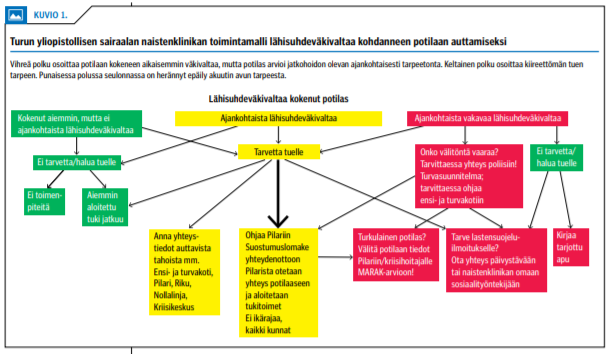 TYKS:n uusi seulontapositiivisen potilaan hoitoonohjauskaavio noudattaa liikennevalojen värikoodeja (kuvio 1 «»3). Mikäli seulonnassa herää epäily akuutin avun tarpeesta, potilas ohjataan välittömästi kriisihoitajan kautta moniammatilliseen riskinarvioon (MARAK), jolla pyritään auttamaan vakavaa parisuhdeväkivaltaa kokeneita uhreja tai sen uhan alla eläviä henkilöitä.