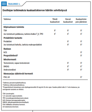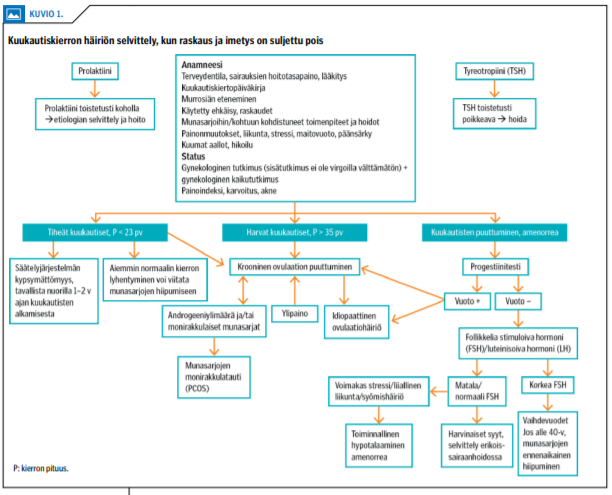 Kuukautiskierto-ongelmia voivat aiheuttaa myös kohdun elimelliset viat, kuten polyypit ja myoomat. Ne on jätetty tämän artikkelin ulkopuolelle, kuten myös runsaat kuukautiset, joista on tuore Käypä hoito -suositus (1). Myöskään primaarista amenorreaa ei tässä artikkelissa käsitellä.