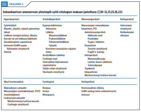 Yleisimmät sekundaarisen amenorrean syyt on lueteltu taulukossa 2 «»3. Fysiologisten syiden jälkeen yleisimmät syyt ovat munasarjojen monirakkulatauti, toiminnallinen amenorrea tai munasarjojen toiminnan hiipuminen ennenaikaisesti (10).