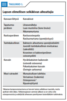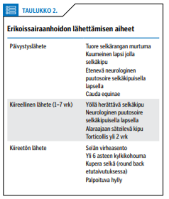 Alle kouluikäisen lapsen selkäkivun taustalta on useimmiten tunnistettavissa selvä orgaaninen syy, ja hoito edellyttää usein nopeaa diagnostiikkaa ja suunnittelua (1) (taulukko 1 «»1). Tästä syystä se on lähes aina aihe erikoissairaanhoidon tutkimuksiin (taulukko 2 «»2).