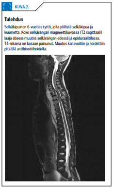 Selkäkivun esiintyvyydestä alle kouluikäisillä ei ole tehty epidemiologisia tutkimuksia, mutta lääkärissäkäynnin syynä selkä- tai niskakipu on kokemukseni perusteella harvinainen. Oireen taustalla voi olla hyvin monenlaisia syitä, esimerkiksi nikaman hyvänlaatuinen kasvain (mm. osteoidi osteooma, osteoblastooma) (kuva 1 «»3) tai eosinofiilinen granulooma (6), selkärangan bakteeritulehdus (kuume, korkea lasko, CRP:n nousu) (kuva 2 «»4) tai selkäytimen kasvain. Joskus harvoin syynä voi olla yleissairaus, kuten leukemia tai aineenvaihdunnan häiriö.