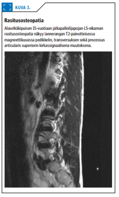 Kliinisenä löydöksenä voidaan todeta L5-nikaman okahaarakkeen palpaatioarkuus. Laséguen testissä alaraaja ei välttämättä nouse yli 60 asteen. Rasitusosteopatia ei näy natiiviröntgenkuvissa, mutta magneettikuvassa se näkyy lannenikaman hohkaluun turvotuksena (kuva 3 «»5). Murtuma-asteelle edennyt spondylolyysi näkyy myös natiivikuvissa.