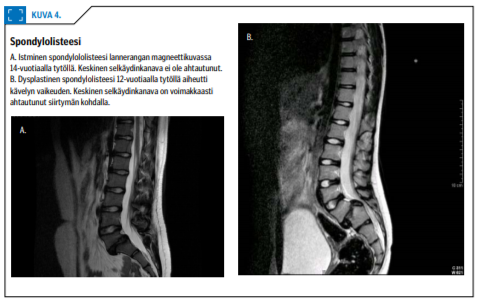 Spondylolisteesin taustalla voi myös olla synnynnäinen fasettinivelten vajaakehitys, jolloin nikaman siirtyessä myös keskinen selkäydinkanava ahtautuu (kuva 4B «»6). Useimmille potilaille kehittyy tällöin kipuskolioosi tai kävelyn vaikeus. Hoitamaton suuriasteinen spondylolisteesi voi edetä kasvuikäisellä spondyloptoosiin.