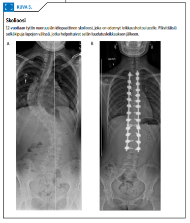 Idiopaattiseen skolioosiin tai Scheuermannin tautiin liittyy noin kolmasosalla lapsista selkäkipua, joka selkärangan luudutusleikkauksen jälkeen helpottuu merkittävästi (4) (kuva 5 «»7). Kivuliaan skolioosin taustalta tulee kuitenkin sulkea pois muut syyt. Muiden syiden todennäköisyys kasvaa, jos käyryys on epätyypillinen, esimerkiksi vasemmalle kupera rintarangan käyryys.