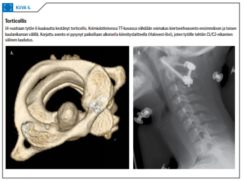 Mikäli oireenmukainen hoito ei auta, lapsi on syytä lähettää erikoissairaanhoitoon, jossa tehdään jatkotutkimuksena kaularangan tietokonekerroskuvaus (kuva 6 «»8). Jos vaivalle ei löydy selitystä, asetetaan lapsi yön ylitse ns. remmivetoon (Glissonin veto). Tämä yleensä laukaisee tilanteen. Jatkohoitona käytetään kovaa yksilöllistä kauluria kahden viikon ajan.