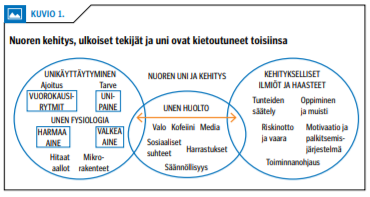 Univaiheiden (vaihe 1, N1; vaihe 2, N2; vaihe 3, N3, syvä uni tai hidasaaltouni; vilkeuni, REM) suotuisa kesto ja ajoitus edistävät terveyttä, hyvinvointia ja kehitystä (7). Normaaliin yöuneen kuuluu univaiheiden vaihtelu siten, että niitä kaikkia on kullekin kehitysvaiheelle riittävästi. Tyypillisesti nukkuvalla nuorella ensimmäisten tuntien aikana esiintyy syvää unta, ja REM-unen määrä lisääntyy aamua kohti (kuvio «»2).