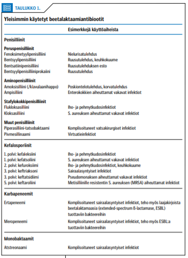 Penisilliinit kuten myös kefalosporiinit, karbapeneemit ja monobaktaamit kuuluvat beetalaktaamiantibiootteihin (taulukko 1 «»1). Vuonna 2010 ne kattoivat yli 60 % maailmassa käytetyistä antibiooteista (3). Käypä hoito -suosituksissa beetalaktaamit ovat ensisijainen antibioottihoito kaikissa bakteeri-infektioissa. Ne ovat myös yleisimpiä antibiootteihin liitettyjen yliherkkyysreaktion aiheuttajia, osin laajan käytön vuoksi (4). Ilmoitetut allergiat rajoittavat tällä hetkellä merkittävästi lääkeryhmän käyttöä.