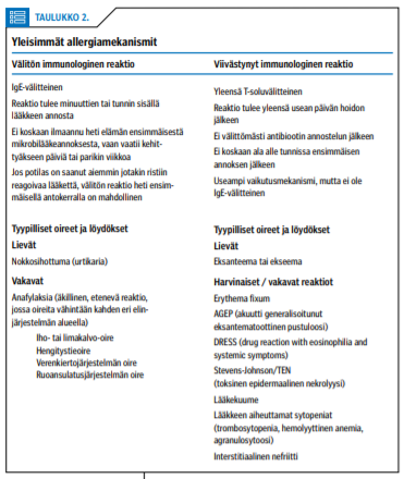 Penisilliiniallergiat jaetaan välittömiin IgE-välitteisiin ja viivästyneisiin, yleisimmin T-soluvälitteisiin, yliherkkyysreaktioihin. Potilaan allergiamekanismin arviointi on tärkeää tulevan antibioottihoidon suunnittelemiseksi (taulukko 2 «»2). Allergiamekanismeja ja tyypillisiä yliherkkyysreaktioita on kuvattu kotimaisissa katsauksissa (5,6).