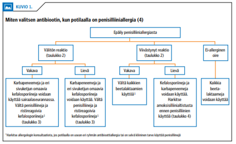 Viivästyneet reaktiot (taulukko 2 «»2) ovat huonommin ymmärrettyjä, joten vakavan viivästyneen reaktion saaneiden hoidossa suositellaan välttämään kaikkia beetalaktaamiryhmän antibiootteja (4,9). Päätöksenteon tueksi on kehitetty algoritmeja (kuvio 1 «»4).