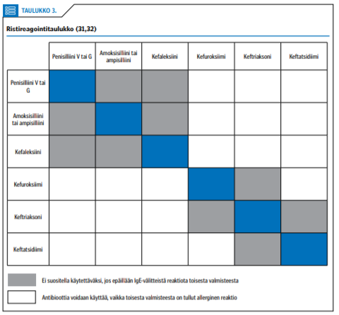 Ristireagointia arvioitaessa onkin huomioitava sivuketjujen samankaltaisuus (taulukko 3 «»3). Amoksisilliinin ja kefaleksiinin sivuketjut ovat lähes identtiset, joten jos epäillään vakavaa penisilliinin aiheuttamaa IgE-välitteistä reaktiota, ei myöskään kefaleksiinin käyttöä suositella ilman allergologisia tutkimuksia. Penisilliinin ja kefuroksiimin välisen ristireagoinnin riski sen sijaan on pieni (32).