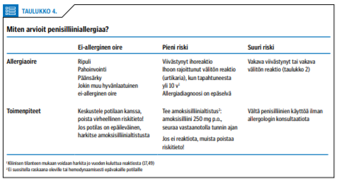 Erityisen tärkeää penisilliiniallergian todenperäisyyden arviointi on potilailla, jotka tarvitsevat paljon antibioottihoitoja. Immuunipuutteisilla potilailla antibioottiallergian arviointi on osoitettu hyödylliseksi, ja sitä suositellaankin rutiininomaisesti osaksi hoitoa (41). Suosittelemme allergian arviointia myös infektioissa, joissa beetalaktaamiryhmän antibiooteilla on ylivertainen teho. Tällaisia tauteja ovat esimerkiksi kuppa, ruusutulehdus ja stafylokokkien sekä streptokokkien aiheuttamat vaikeat yleisinfektiot.