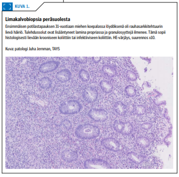 Nuoremmalle miehelle oli tehty sigmoideoskopia, jossa todettiin aktiivinen proktiitti. Koepalalöydös viittasi tulehdukselliseen suolistosairauteen. Vanhemmalle miehelle oli tehty kolonoskopia, jossa myös hänellä todettiin aktiivinen proktiitti. Koepalalöydös sopi aktiiviseen tulehduksellisen suolistosairauden tyyppiseen krooniseen proktiittiin (kuva 1 «»1).