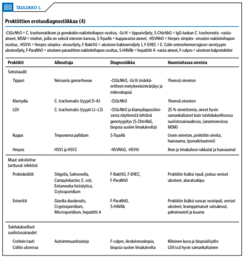 On hyvä muistaa, että anaaliyhdynnässä voivat tarttua myös "tavallinen" klamydia (C. trachomatiksen tyypit D-K) ja tippuri. Haavauttava tulehdus peräsuolessa voi seurata myös kuppa- tai herpestartunnasta. Näiden kaikkien aiheuttaman akuutin distaalisen proktiitin oireisiin kuuluvat peräaukon kipu, limainen tai verinen vuoto, ummetus, rektumin täyttymisen tai epätäydellisen ulostamisen tunne ja tenesmus eli ulostamispakko (5).