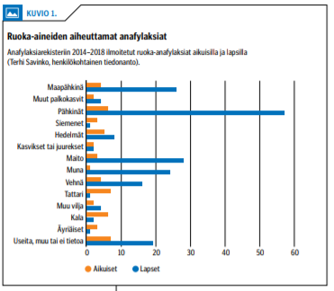 Aikuisilla anafylaksian riski liittyy erityisesti maapähkinä-, pähkinä-, äyriäis- ja kala-aller-giaan (22-24). Ruoka-anafylaksia on yleisempää lapsilla (25). Anafylaksioita on arvioitu ruoka-allergisilla potilailla olevan 1 tapaus 300 henkilövuotta kohti (25). Noin 20 % Euroopan anafylaksiarekisteriin ilmoitetuista aikuisten anafylaksioista on ollut ruoan aiheuttamia (26). Suomessa aikuisten tavallisimpia ruoka-anafylak-sian aiheuttajia ovat anafylaksiarekisterin perusteella pähkinät (Terhi Savinko, henkilökohtainen tiedonanto) (kuvio 1 «»2).