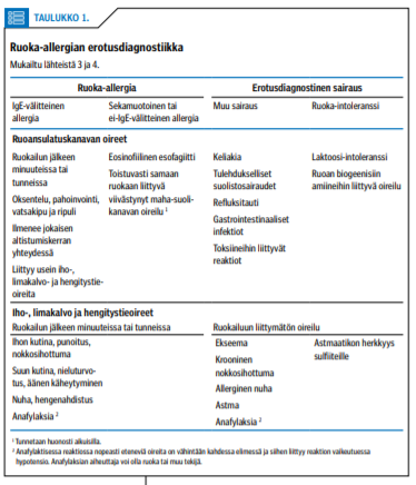 Tavallisia erotusdiagnostisia vaihtoehtoja suolisto-oireisilla potilailla ovat ärtyvän suolen oireyhtymä, laktoosi-intoleranssi ja keliakia (taulukko 1 «»2). Iho-oireisilla kyseessä voi olla krooninen urtikaria ja angioedeema. Hoitamaton astma voi olla hengitystieoireiden ainoa syy (3).