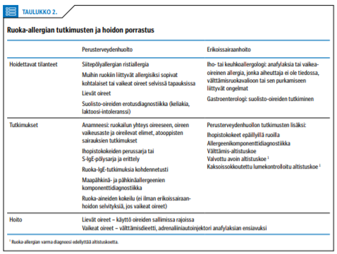 Potilas lähetetään erikoissairaanhoitoon, jos oireet ovat vaikeita eikä syy löydy perusterveydenhuollossa tehdyissä tutkimuksissa, esimerkiksi kun testitulokset vahvan allergiaepäilyn yhteydessä ovat kielteiset tai kun on vaikea selvittää, mikä ruoka-aine on oireiden aiheuttaja (taulukko 2 «»3). Anafylaktisen reaktion saaneet potilaat arvioidaan erikoissairaanhoidossa, jos aiheuttaja ei ole tiedossa.