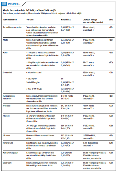 Ruokavalioon, nautintoaineisiin, lihavuuteen ja lääkitykseen liittyy suojaavia ja haitallisia tekijöitä, jotka vähentävät tai lisäävät kihdin ilmaantumista (taulukko «»1) (16-25). Ylipainon on todettu olevan selvä riskitekijä kihdin ilmaantumiselle. Yhdysvaltalaisen tutkimuksen mukaan jo 21-vuotiaana lihava henkilö sairastuu kihtiin keskimäärin 11 vuotta nuorempana kuin saman ikäisenä normaalipainoisena pysynyt henkilö (16). Runsaan lihan ja merenelävien, kanan- ja kalannahkan sekä alkoholin, erityisesti oluen ja väkevien alkoholien käytön yhteys kihtiin on tunnettu pitkään (17,18). Kihtikohtausten riskiä vähentää painon pysyminen normaalirajoissa sekä terveellinen C-vitamiinipitoinen ruokavalio, joka sisältää vähärasvaisia maitotuotteita ja päivittäin vähintään neljä kupillista kahvia (16-21).