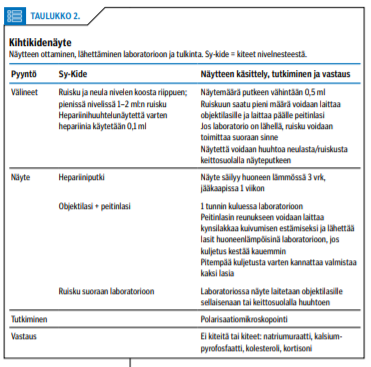 Myös aiemmin tiedossa olevan niveltaudin aktivoituessa on syytä tehdä nivelnestetutkimus, jos epäillään mahdollista oheissairautta. Kiteitä etsitään polarisaatiomikroskopoinnilla. Ohjeet kidenäytteiden ottamiseen ja lähettämiseen on esitetty taulukossa (taulukko «»2). Jos halutaan tutkia myös nivelnesteen solut, hepariiniputkeen otetun näytteen on oltava laboratoriossa tunnin kuluessa. EDTA-putkessa solut säilyvät 6 tuntia, mutta EDTA-putken näytteestä ei voi tutkia kiteitä.