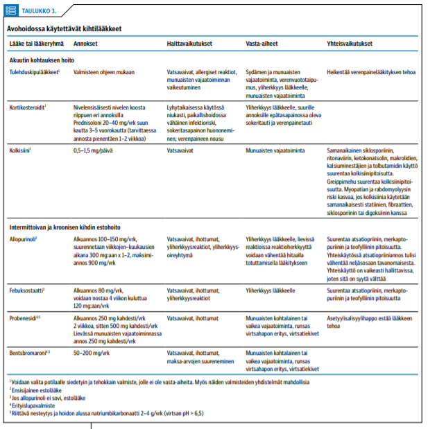 Estolääkkeenä on käytettävissä kaksi ksantiinioksidaasin estäjää: allopurinoli ja febuksostaatti. Niiden vertailututkimukset on tehty vakioannoksilla, joten lääkitysten todellisen vasteen vertailua optimaalisella annoksella ei toistaiseksi ole (31,32). Lääkitykset eivät ole toteutuneet optimaalisesti, vaan annokset ovat monesti olleet liian pieniä hoitotavoitteen saavuttamiseksi. Allopurinolin käyttäjien vähäisiä yliherkkyysreaktioita voidaan ratkaista siedättämällä potilas lääkkeelle alkaen pienellä annoksella ja suurentamalla annos avohoidossa hitaasti käyttöannokseen (33).