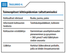 Kun potilaalla on kihtikohtaus, ei kannata jättää käyttämättä tilaisuutta arvioida riskejä (taulukko «»4). Kohtuulliset elintavat ja maltillinen alkoholinkäyttö ovat tärkeimmät keinot ehkäistä käynnissä olevaa epidemiaa, jonka aiheuttavat metabolisen oireyhtymän yleistyminen, alkoholin käytön lisääntyminen, väestön keski-iän kohoaminen ja lääketieteellisen hoidon valinnat.