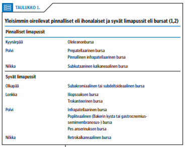 Tässä katsauksessa käydään läpi yleisimpiä bursiitteja sekä niiden diagnostiikkaa ja hoitoa.