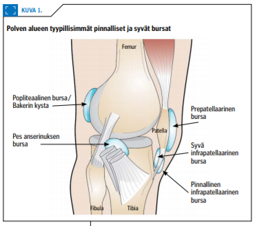 Syvä infrapatellaarinen bursa sijaitsee lumpiojänteen ja sääriluun välissä Hoffan rasvan alapuolella (kuva 1 «»1). Limapussi voi ärtyä polven ojentajalihasten ylikuormituksesta esimerkiksi juoksijoilla ja hyppääjillä. Kipu paikantuu polven etuosaan nivelraosta hieman distaalisesti. Oireilu voi muistuttaa läheisesti patellatendinopatian oireita. Limapussissa voidaan nähdä oireettomillakin henkilöillä hieman nestettä (1,29).