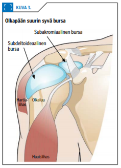 Subakromiaalinen bursa on laaja limapussi, joka rajautuu ylhäältä hartialihaksen alaosaan, olkalisäkkeeseen ja korakoakromiaaliseen ligamenttiin (korppi-olkalisäkeside) sekä alhaalta ylempään lapalihakseen (m. supraspinatus) (kuva 3 «»4). Kirjallisuudessa olkapään limapussien - muun muassa subdeltoidaalisen (hartialihaksen alaisen) ja subakromiaalisen (olkalisäkkeen alaisen) bursan - nimeämisessä esiintyy vaihtelua.