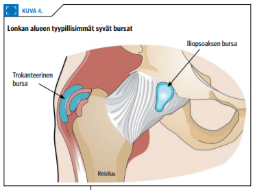 Ison sarvennoisen alueella on kolme bursaa ja niiden oirehdintaan liittyy usein pakaralihasten tendinopatia (kuva 4 «»5). Bursiitti voi olla yksi ison sarvennoisen kipuoireyhtymän (greater trochanteric pain syndrome, GTPS) osatekijä, mutta se ei yleensä ole vaivan primaarinen syy. Ison sarvennoisen kipuoireyhtymässä tendinopatian ja bursiitin erottelu on haastavaa. Erotusdiagnostisesti taustalla voivat olla myös muun muassa traumat, osteonekroosi, infektio, reisiluun kaulan rasitusmurtuma, selän hermojuurikipu, lonkan nivelrikko ja hermopinteet. Myös ison sarvennoisen bursiitin taustalla on usein ylikuormitus (22-24).