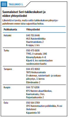 HUS Naistenklinikalle avattiin Seri-tukikeskus vuonna 2017. Siellä on hoidettu jo yli 1 400 raiskauksen uhria. Keskuksen toimintamalli on julkaistu joulukuussa 2018, ja ensimmäisen vuoden potilaita kuvaileva tutkimus julkaistiin vastikään (1,2). Uhrin tutkimisen osalta toimintamalli perustuu aiemmin julkaistuun ns. RAP-kansioon (Seksuaalista väkivaltaa kokeneen tutkimus- ja hoito terveydenhuollon toimipisteissä - Raiskatun akuuttiapu) ja kansainvälisiin käytäntöihin (3,4). Erityisesti tukipalveluiden suunnitteluun mallia on otettu mm. Tukholman Södersjukhusissa toimivasta Akutmottagning för våldtagna -yksiköstä (5).