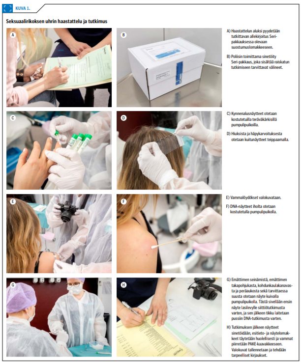Esitutkintalain ja oikeudenkäymiskaaren perusteella terveydenhuoltohenkilökunta on seksuaalirikosasioissa velvollinen antamaan asian selvittämiseksi tarpeelliset tiedot lääkärinlausunnolla (12,28). Lausunnossa kuvaillaan tutkittavan kertomat tapahtumatiedot, lääkärintarkastuksessa todetut vamman merkit tai niiden puuttuminen, otetut näytteet ja sukupuoliteitse tarttuvien tautien seulontanäytteet tuloksineen. Lisäksi tulkitaan löydökset ja otetaan kantaa tutkittavalle koituneisiin haittoihin.
