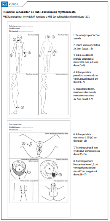 Poliisin vihreät esitieto- ja keltaiset näytelomakkeet täytetään huolellisesti tutkimuksen jälkeen (kuva 1H «»3). Kehokarttaan eli PAKE-kaavakkeeseen kirjataan ja piirretään todetut vammat, ja vammoista otetut valokuvat tallennetaan (taulukko 3 «»4, kuvio 1 «»5). Kopiot kaikista kaavakkeista laitetaan Seri-pakkauksen sisään tai sinetöidään kirjekuoressa pakkauksen päälle. Alkuperäiset dokumentit arkistoidaan mahdollisen lausunnon tekoa varten. Lomakkeiden täyttämisen jälkeen tehdään kirjaukset sairauskertomukseen hoidollisilta osin (24).