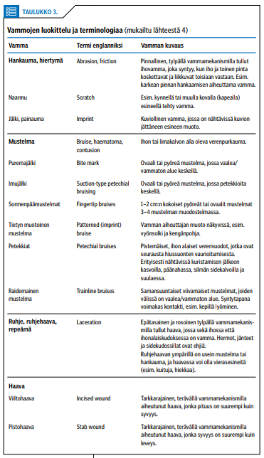 Vammojen syntyyn ja havaitsemiseen vaikuttavat tutkimustekniikan lisäksi mm. tutkittavan ikä, aiemmat yhdyntäkokemukset, aika tapahtumasta sekä vammojen määritelmä (4). Taulukkoon 3 «»4 on koottu vammojen määrittelyyn liittyvää sanastoa (4).